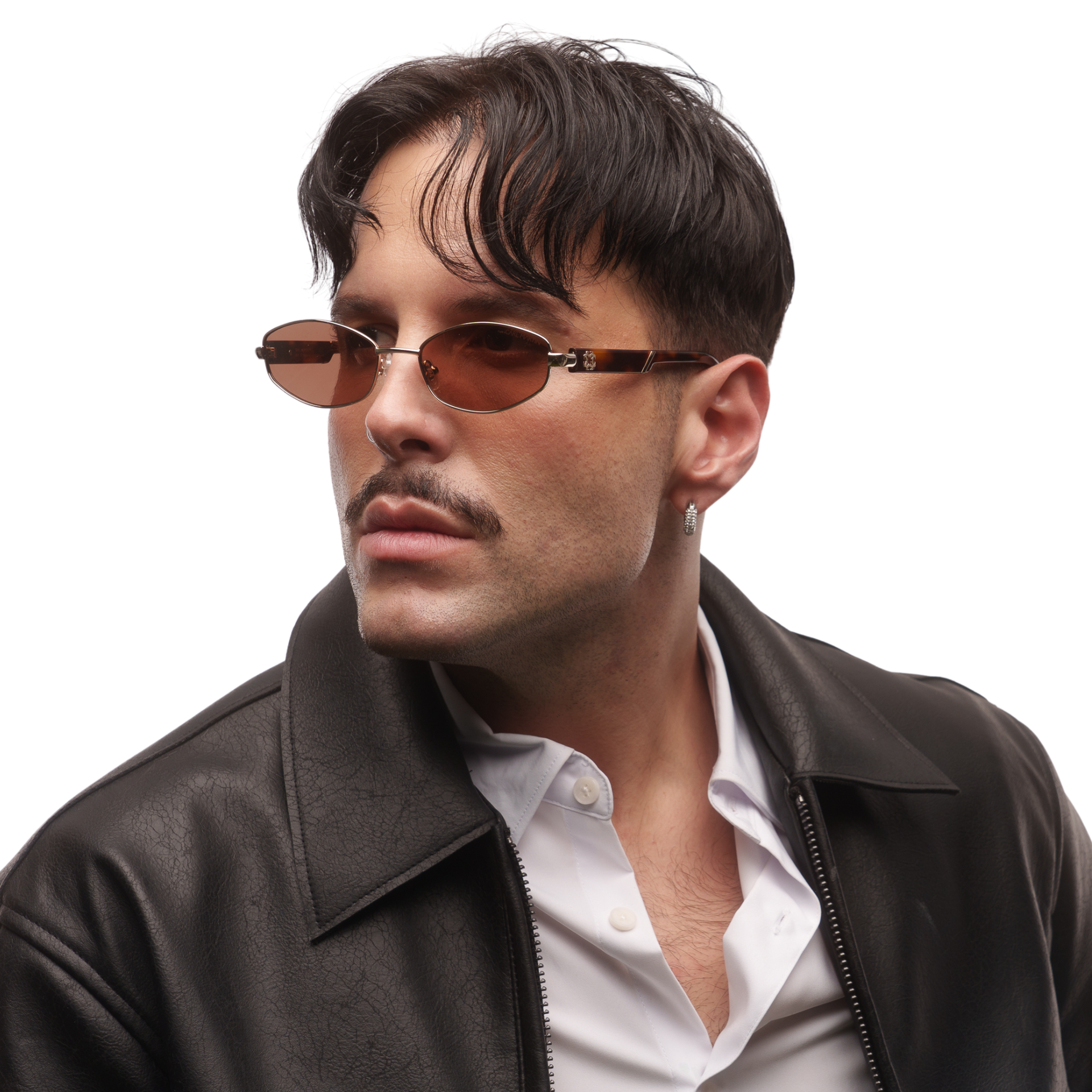 Montura con frontal metálico de forma geométrica, combinada con varillas de acetato. Incorpora un logotipo metálico en relieve 3D en la varilla y un detalle metálico integrado que aporta continuidad al diseño.