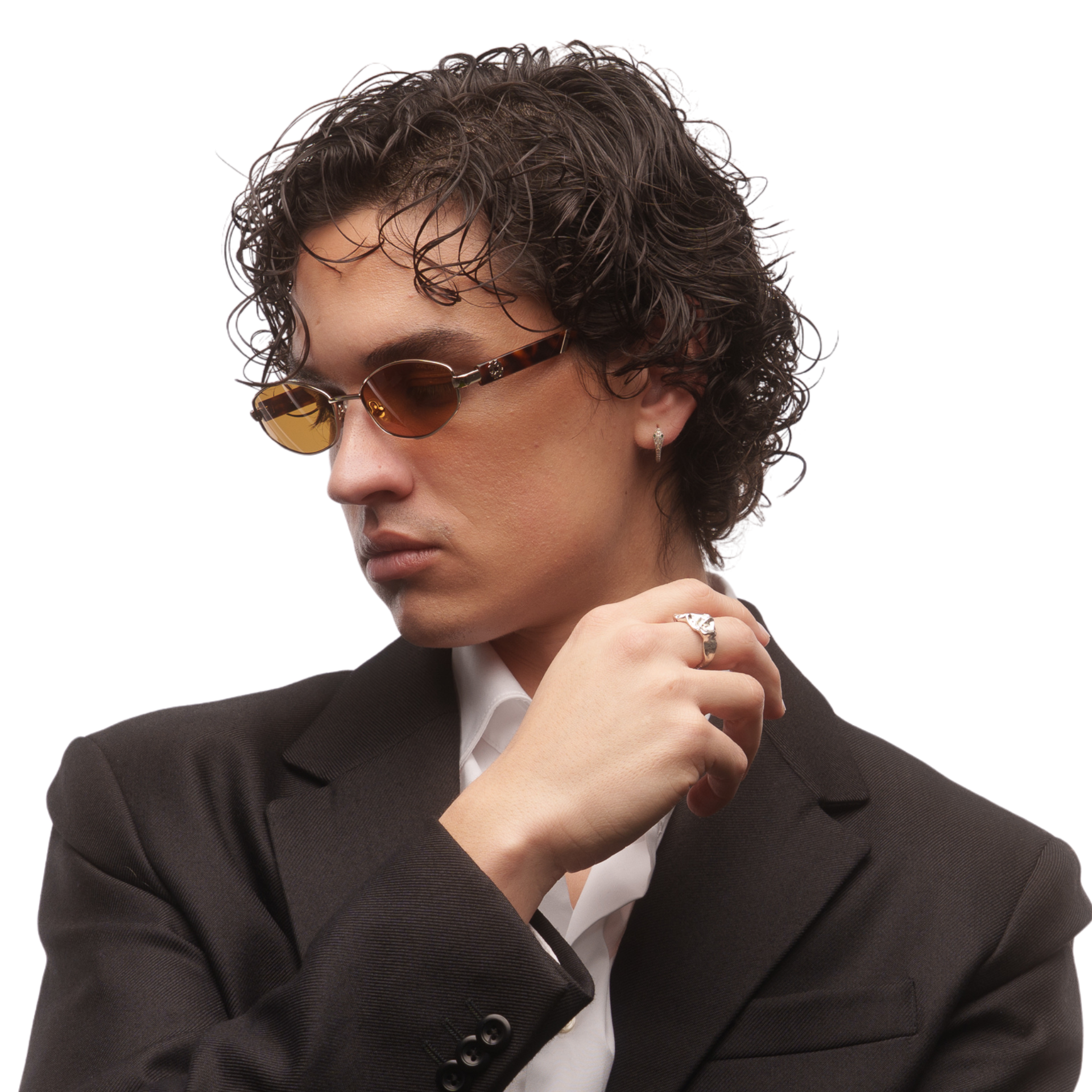 Montura con frontal metálico de forma geométrica, combinada con varillas de acetato. Incorpora un logotipo metálico en relieve 3D en la varilla y un detalle metálico integrado que aporta continuidad al diseño.