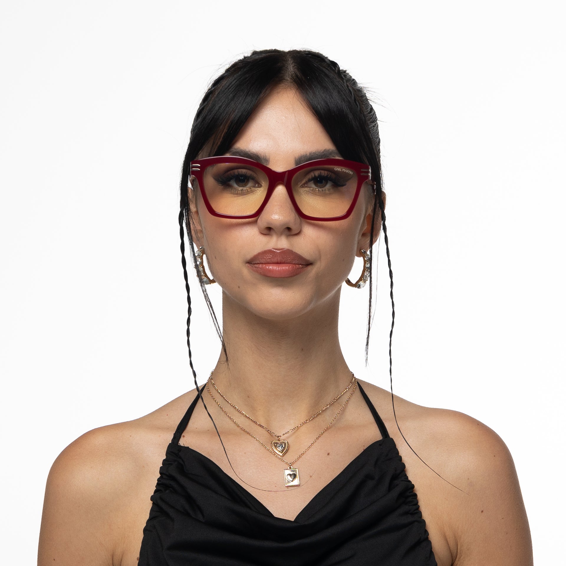 Montura rectangular de acetato multicapa, con un acabado pulido a mano que aporta profundidad visual. En el frontal, destacan inserciones metálicas doradas que refuerzan la estructura. Las bisagras con recubrimiento dorado garantizan una apertura fluida y una durabilidad superior.