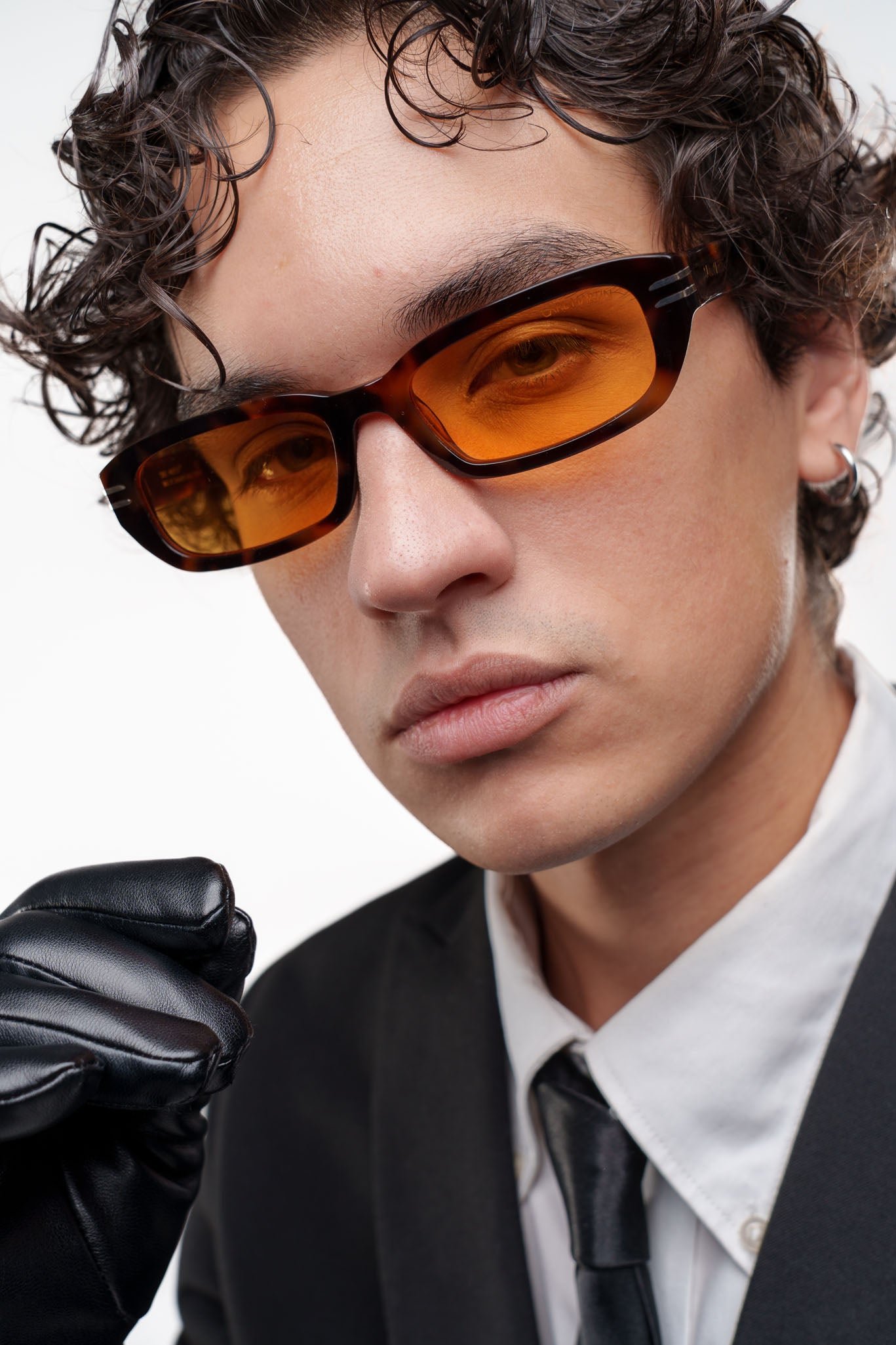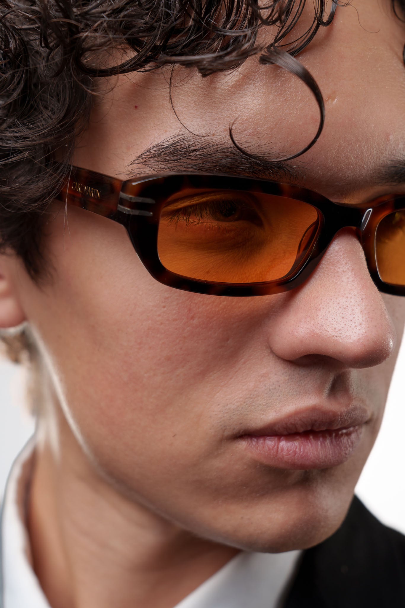 Montura rectangular de acetato multicapa, con un acabado pulido a mano que aporta profundidad visual. En el frontal, destacan inserciones metálicas doradas que refuerzan la estructura. Las bisagras con recubrimiento dorado garantizan una apertura fluida y una durabilidad superior.