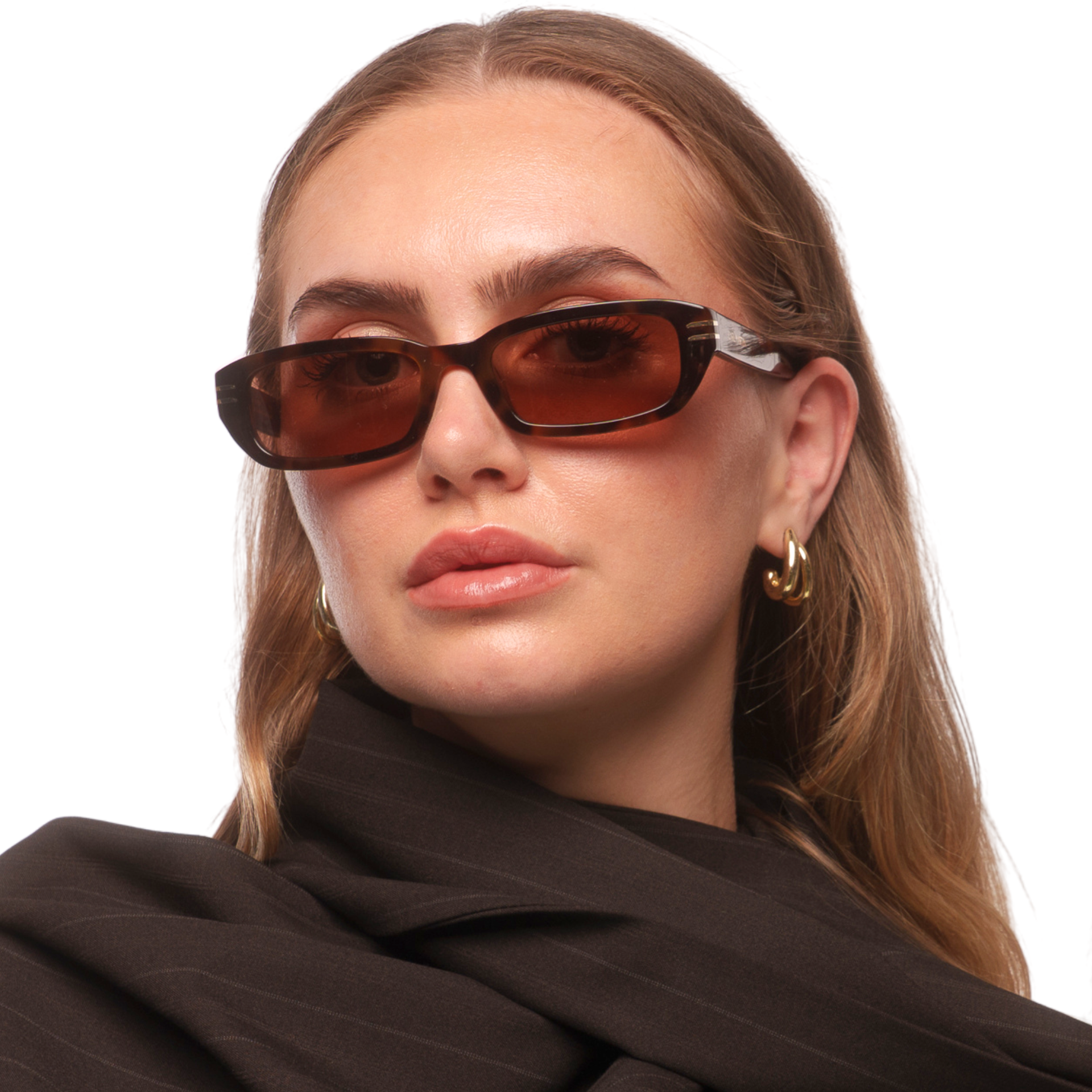 Montura rectangular de acetato multicapa, con un acabado pulido a mano que aporta profundidad visual. En el frontal, destacan inserciones metálicas doradas que refuerzan la estructura. Las bisagras con recubrimiento dorado garantizan una apertura fluida y una durabilidad superior.