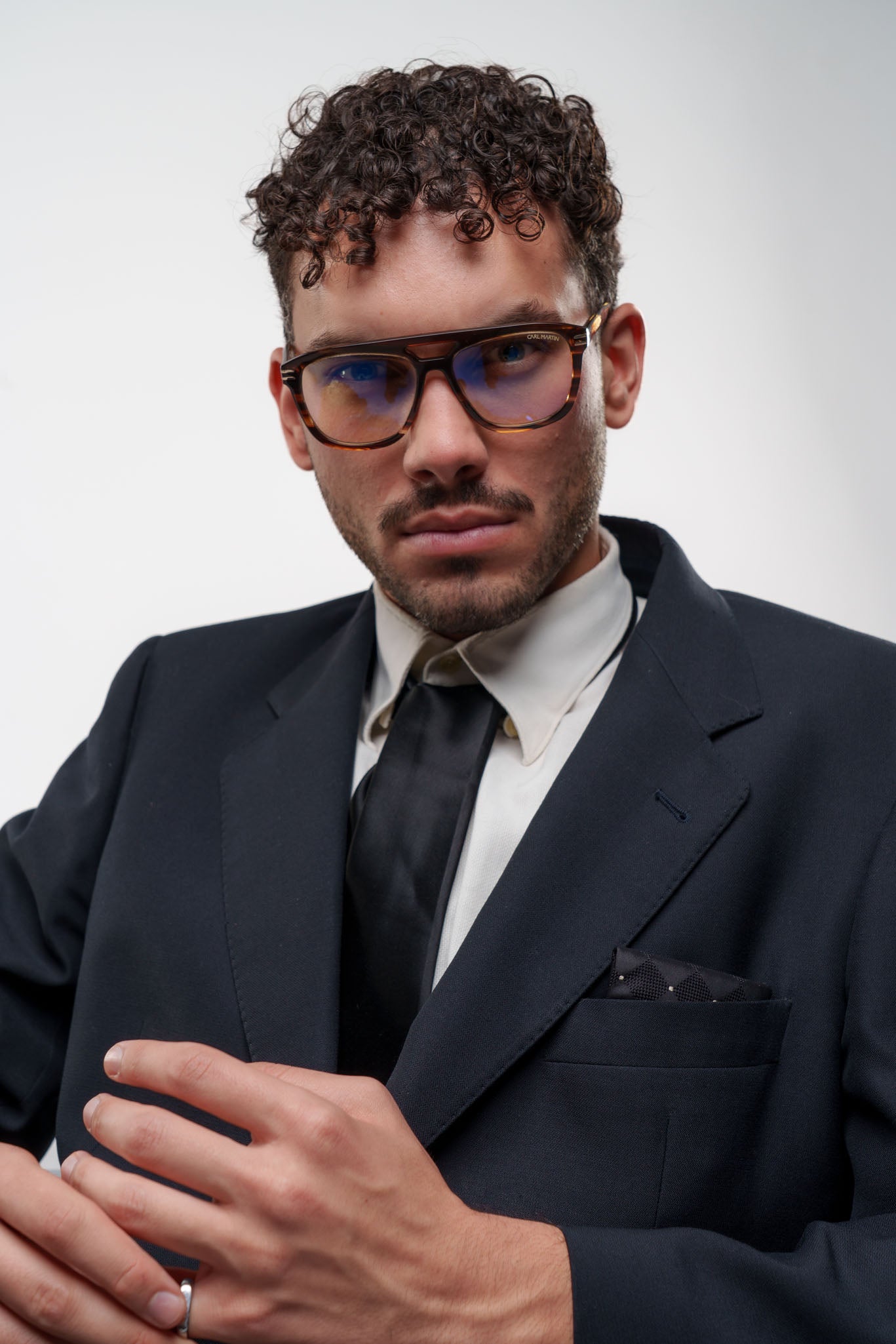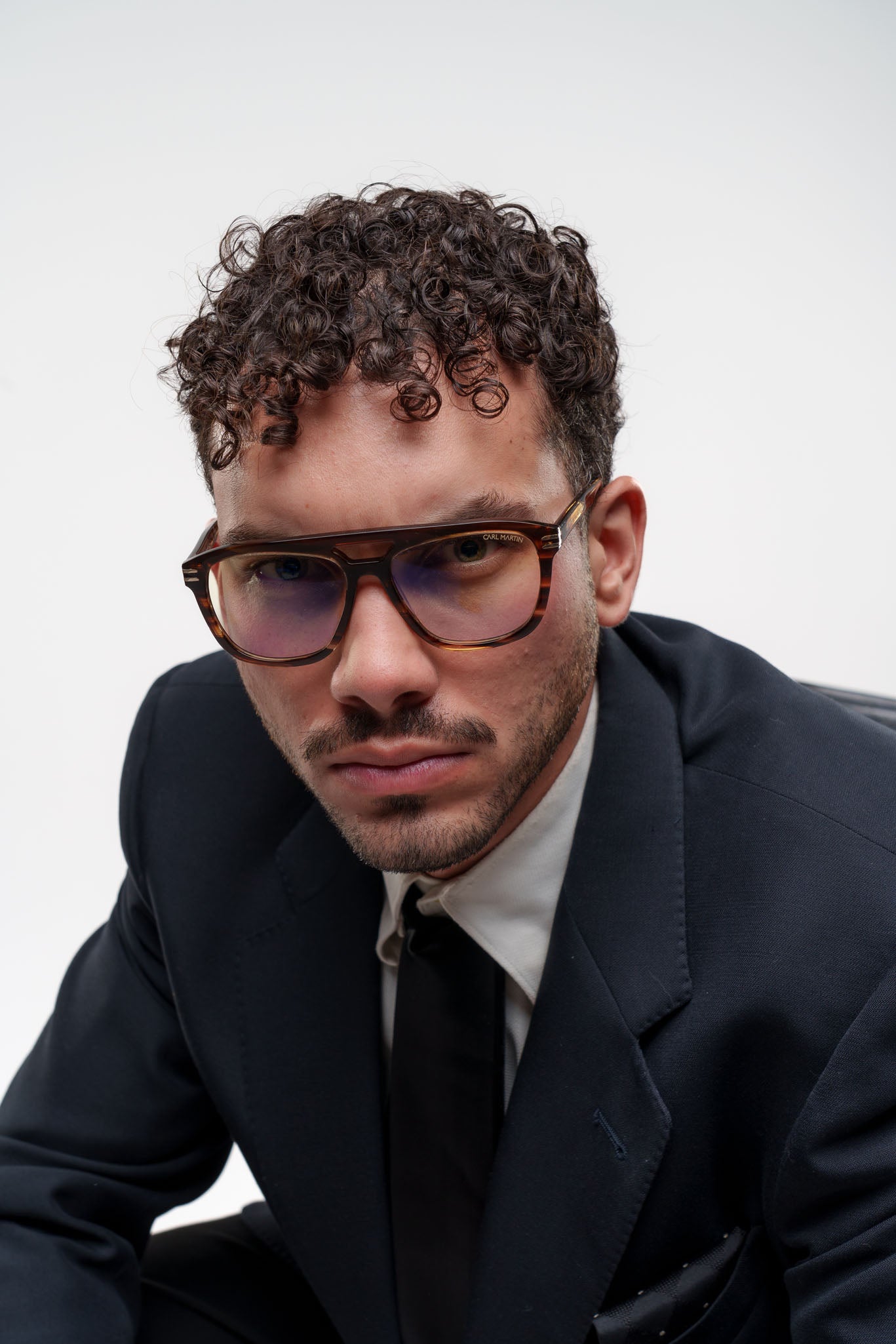 Montura rectangular de acetato multicapa, con un acabado pulido a mano que aporta profundidad visual. En el frontal, destacan inserciones metálicas doradas que refuerzan la estructura. Las bisagras con recubrimiento dorado garantizan una apertura fluida y una durabilidad superior.